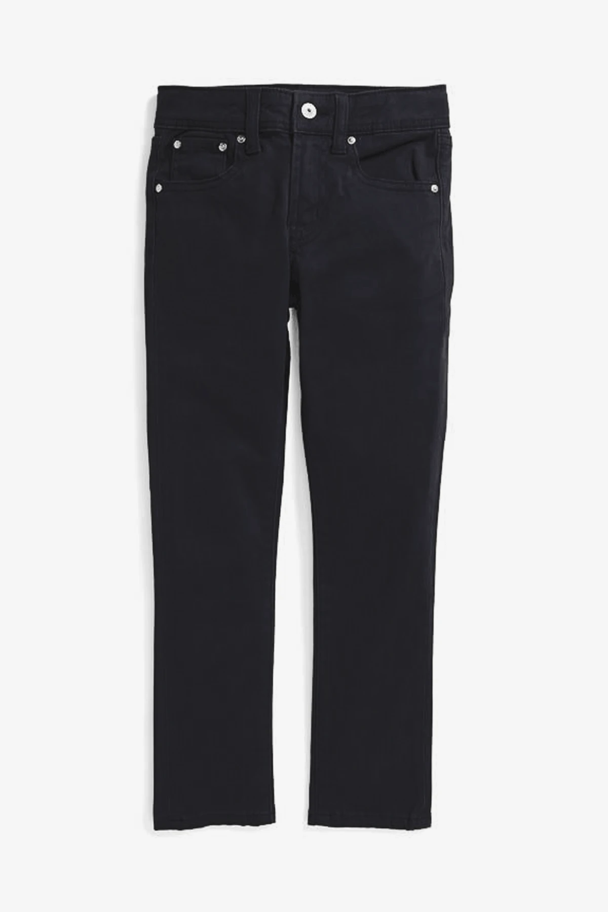 in black. Features an adjustable waistband and five-pocket styling. Snap button closure up to Size 7, button and zip fly from Size 8 and up.Β Made in 97% cotton, 3% spandex, machine wash.