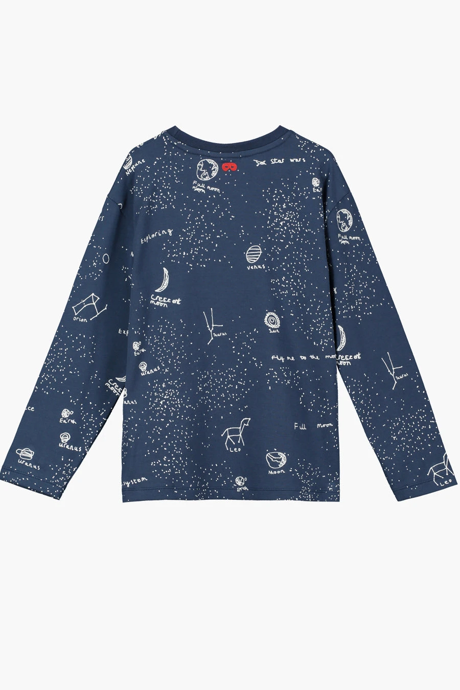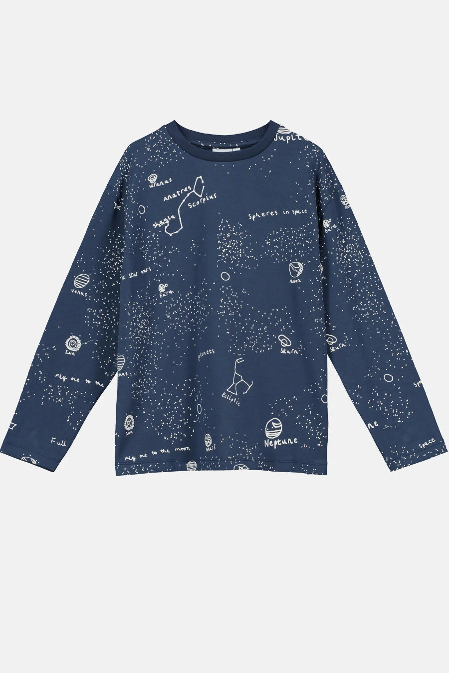 is a long sleeve tee that features an allover space theme design featuring the planets and constellations. Made in 95%