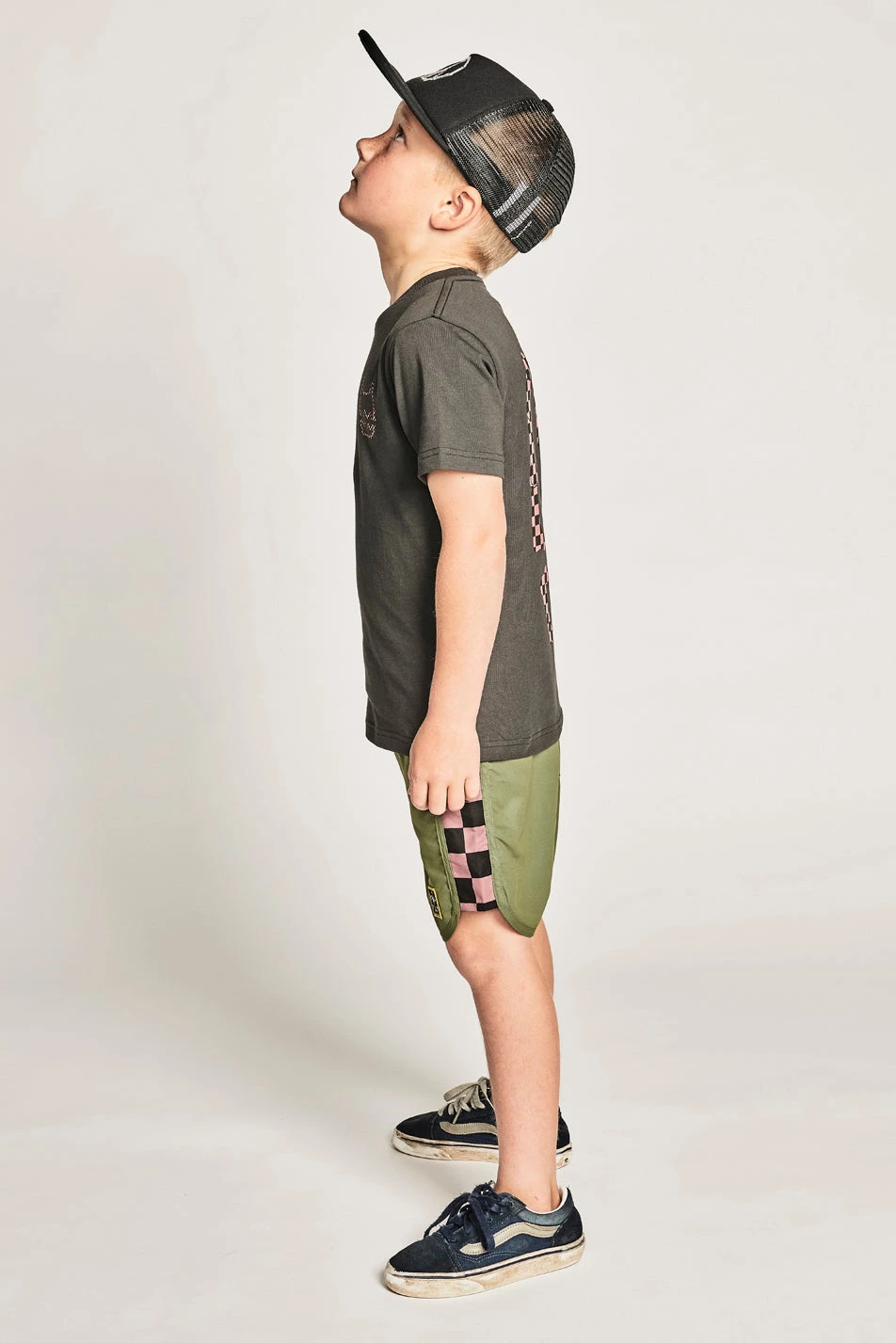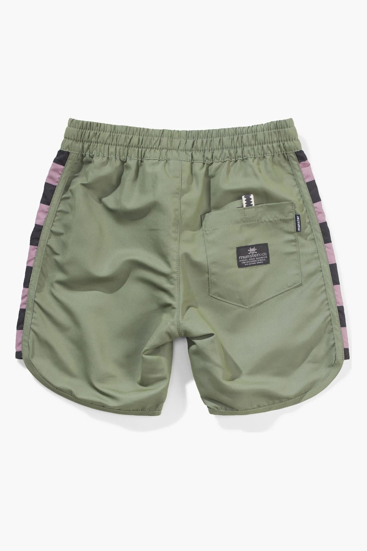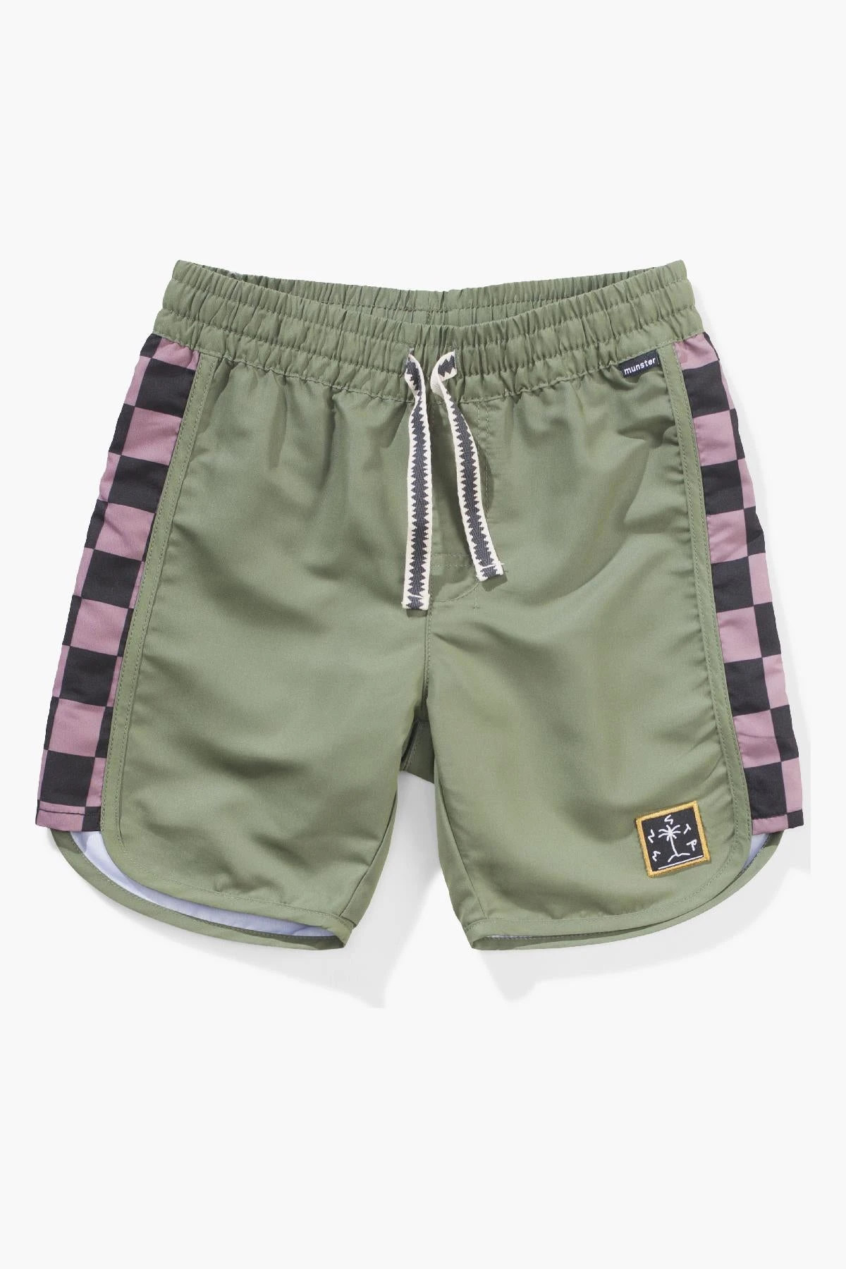 for in and out of the water, which features a checker print along the sides, a rear pocket and an elasticized and drawstring waist. These