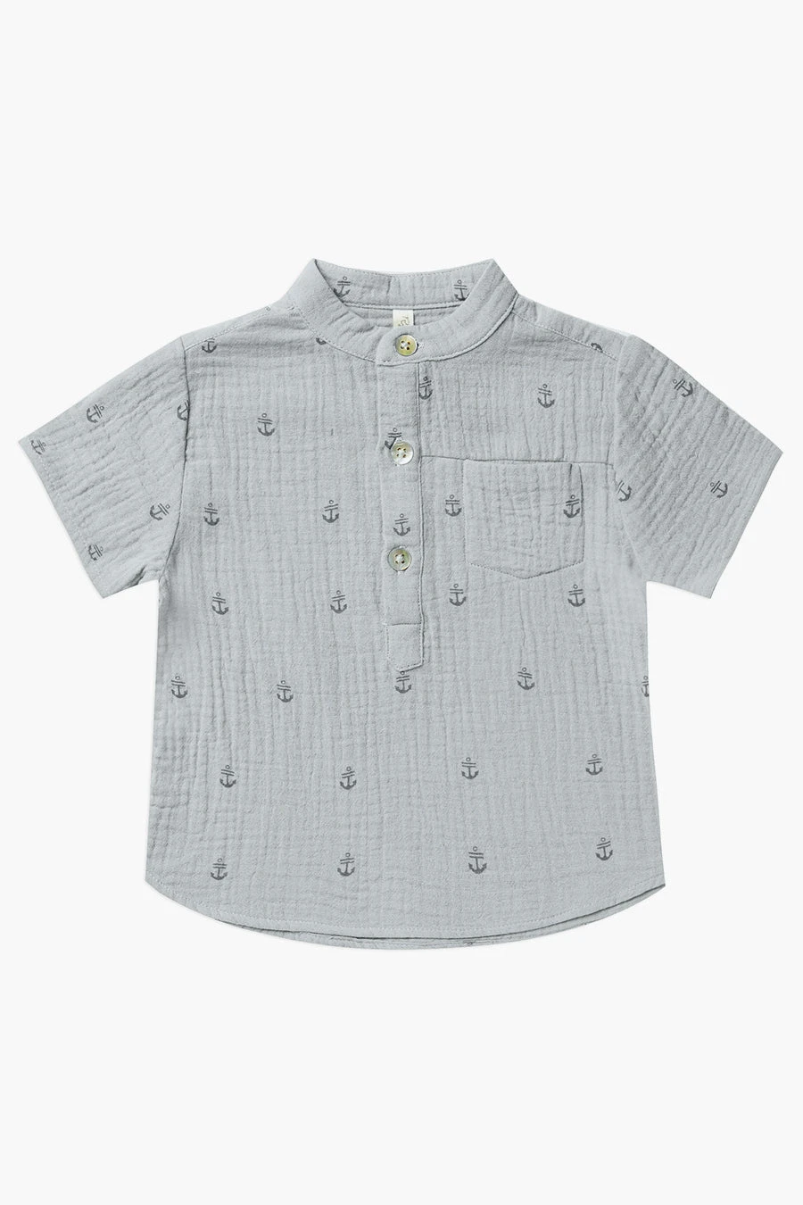 weather. Features a mandarin collar, buttons down the front, and a small front pocket. Made of