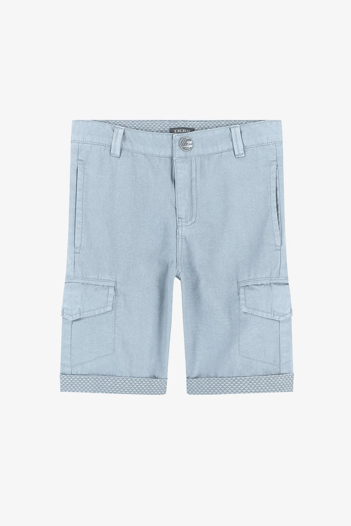 in a silvery blue. Features front and back pockets, cargo pockets on the sides, adjustable waistband and tab front button for