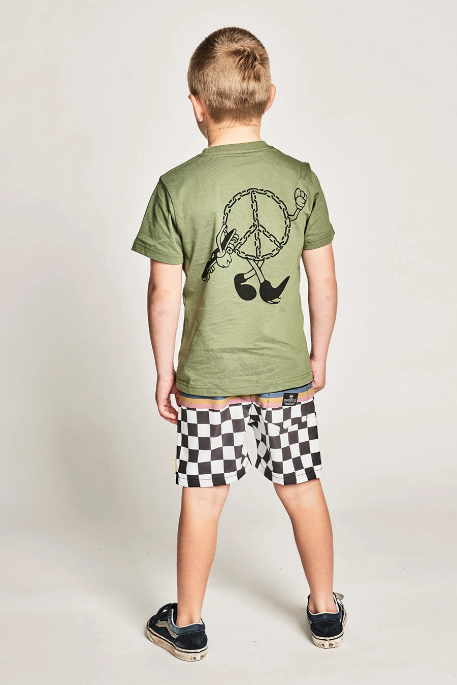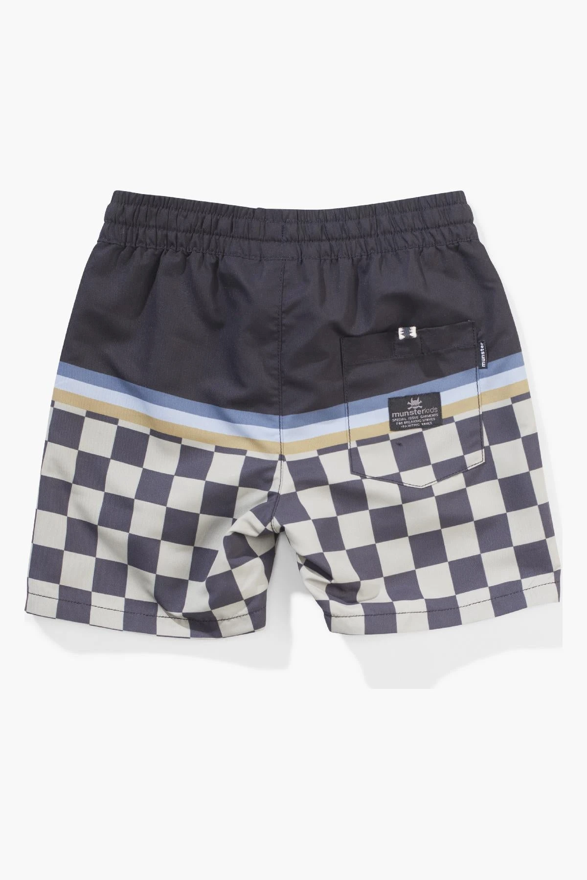 in a checkerboard print with a rear pocket and an elasticized and drawstring waist. Perfect in and out of the water. These shorts can be worn to the playground or to the