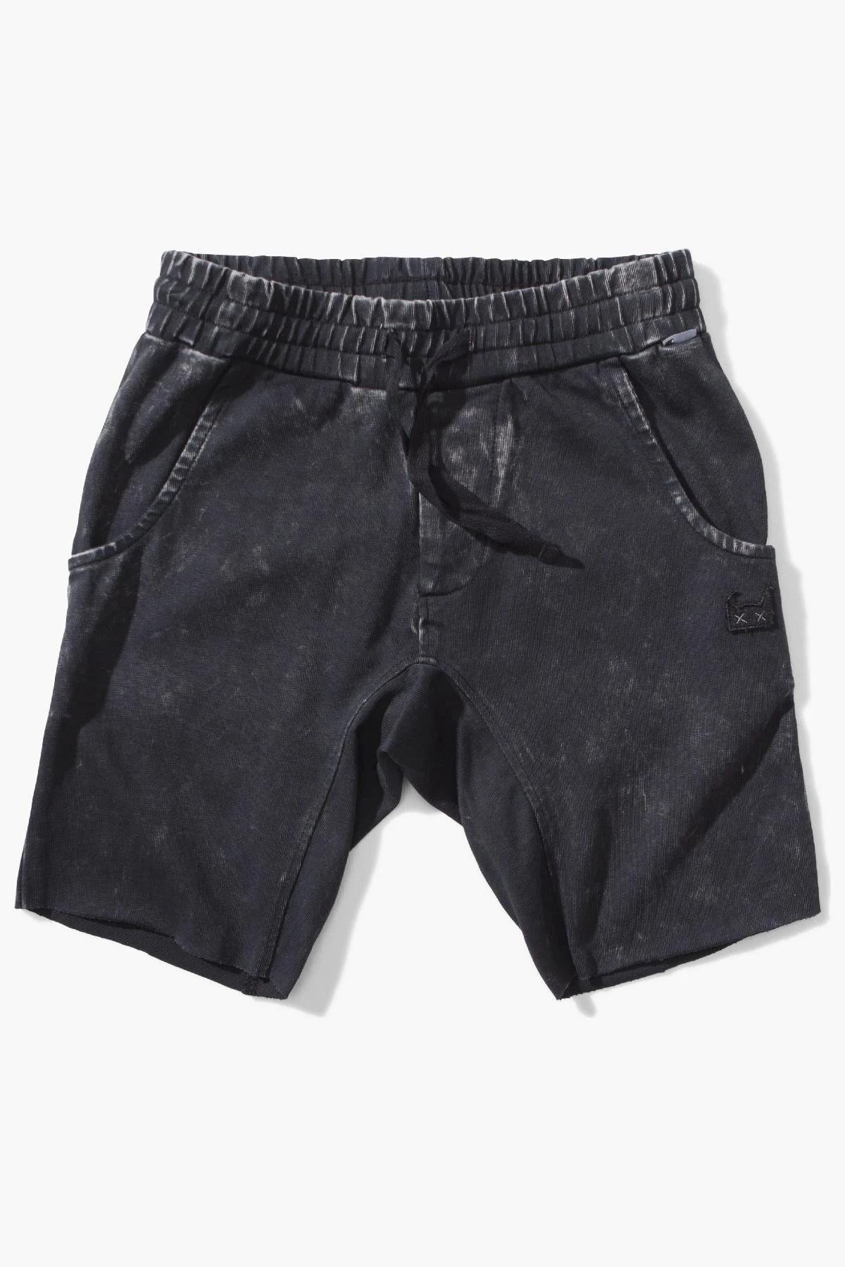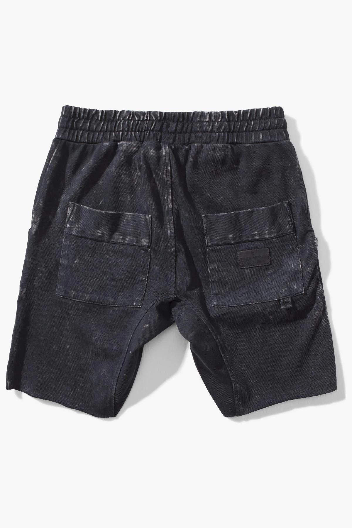 is made in a soft black with an acid wash, has two side pockets and an adjustable elastic waistband for