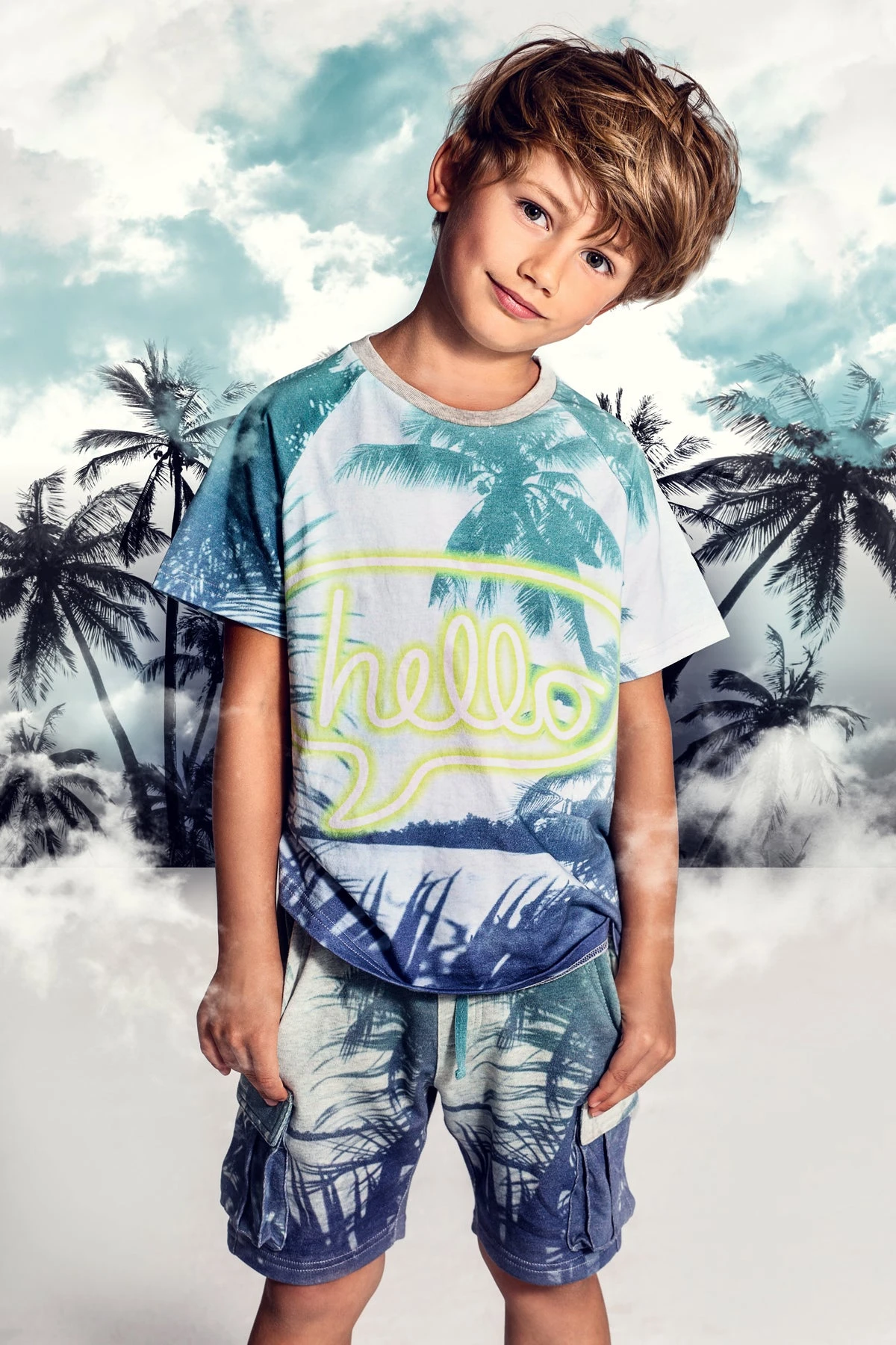 with an ombre palm print. Features an elasticized, adjustable waist with front, side and back pockets. 100% organic cotton knit, machine wash.