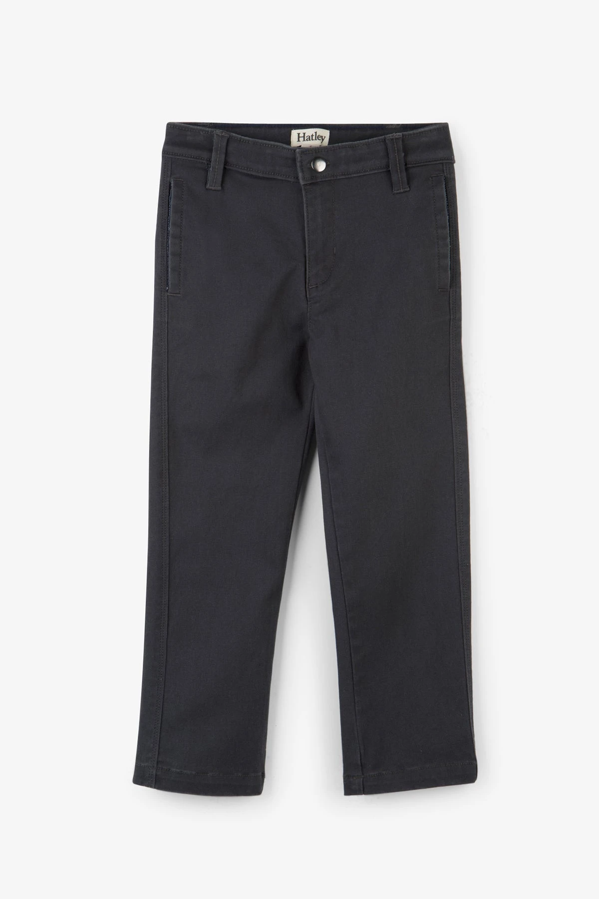 for any occasion. Features an adjustable elastic waistband on the inside, functional front fly with snap closure, front side pockets, and single welt pockets at the back. 98% cotton, 2% spandex, machine wash.