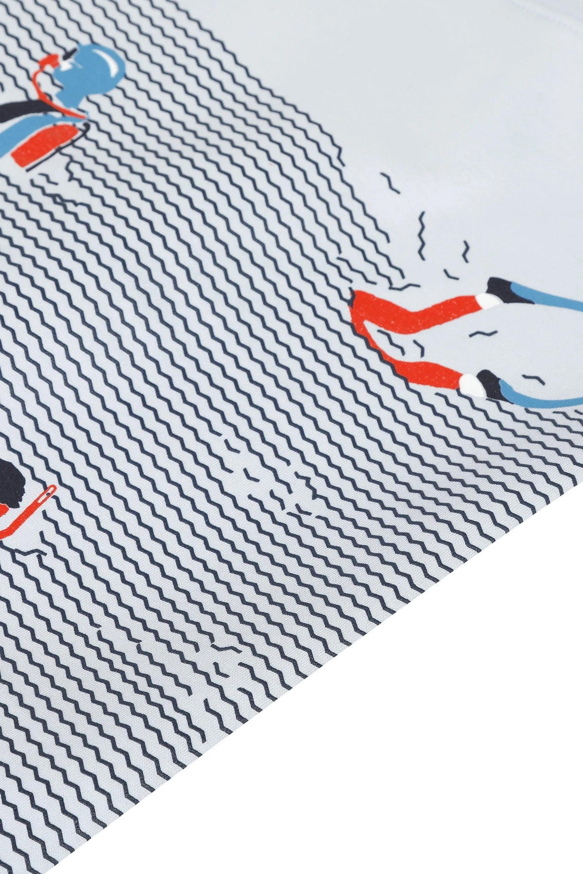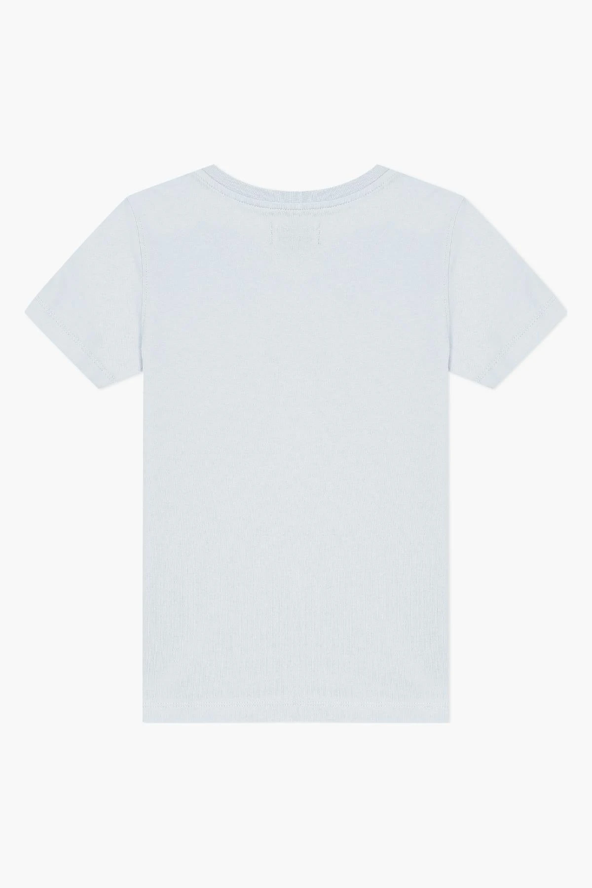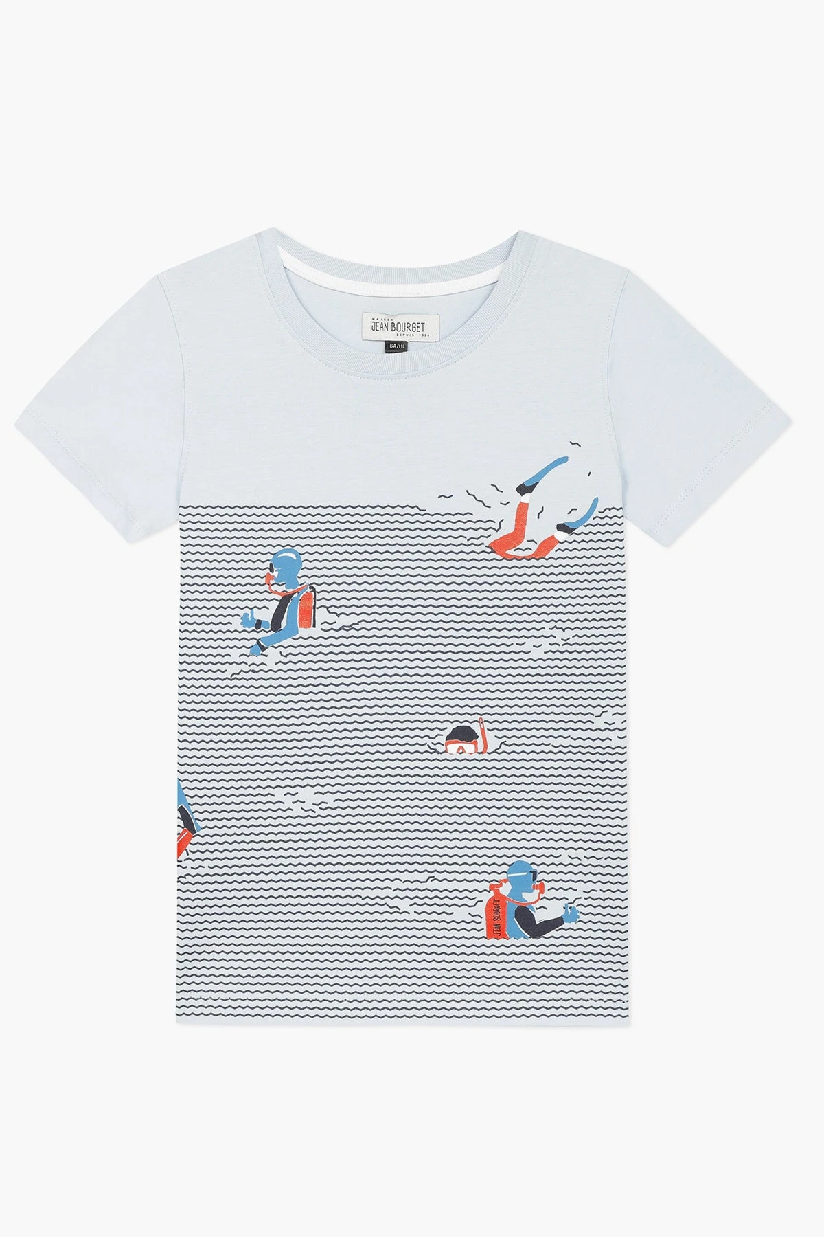 features a scuba diver graphic on the front and comes in a light ocean blue color. 100% cotton, machine wash.