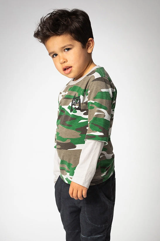that will pair well with the Joss Camo Sweatpant or a favorite jean or pant. Features a long sleeve shirt with a camo pattern overlay. 75% cotton, 25% polyester, machine wash, tumble dry low.