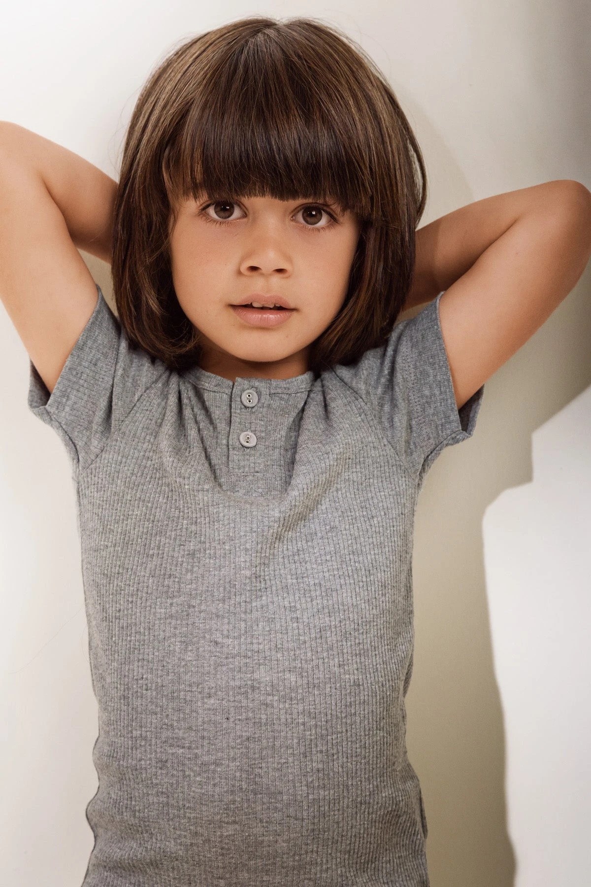 featuring two buttons at the neck and a banded hem. Pair it with