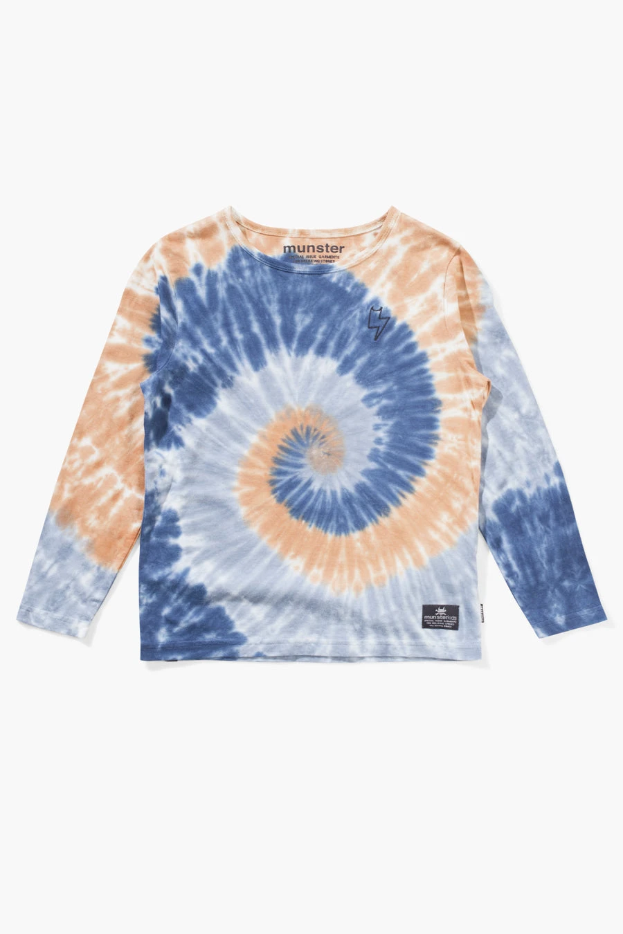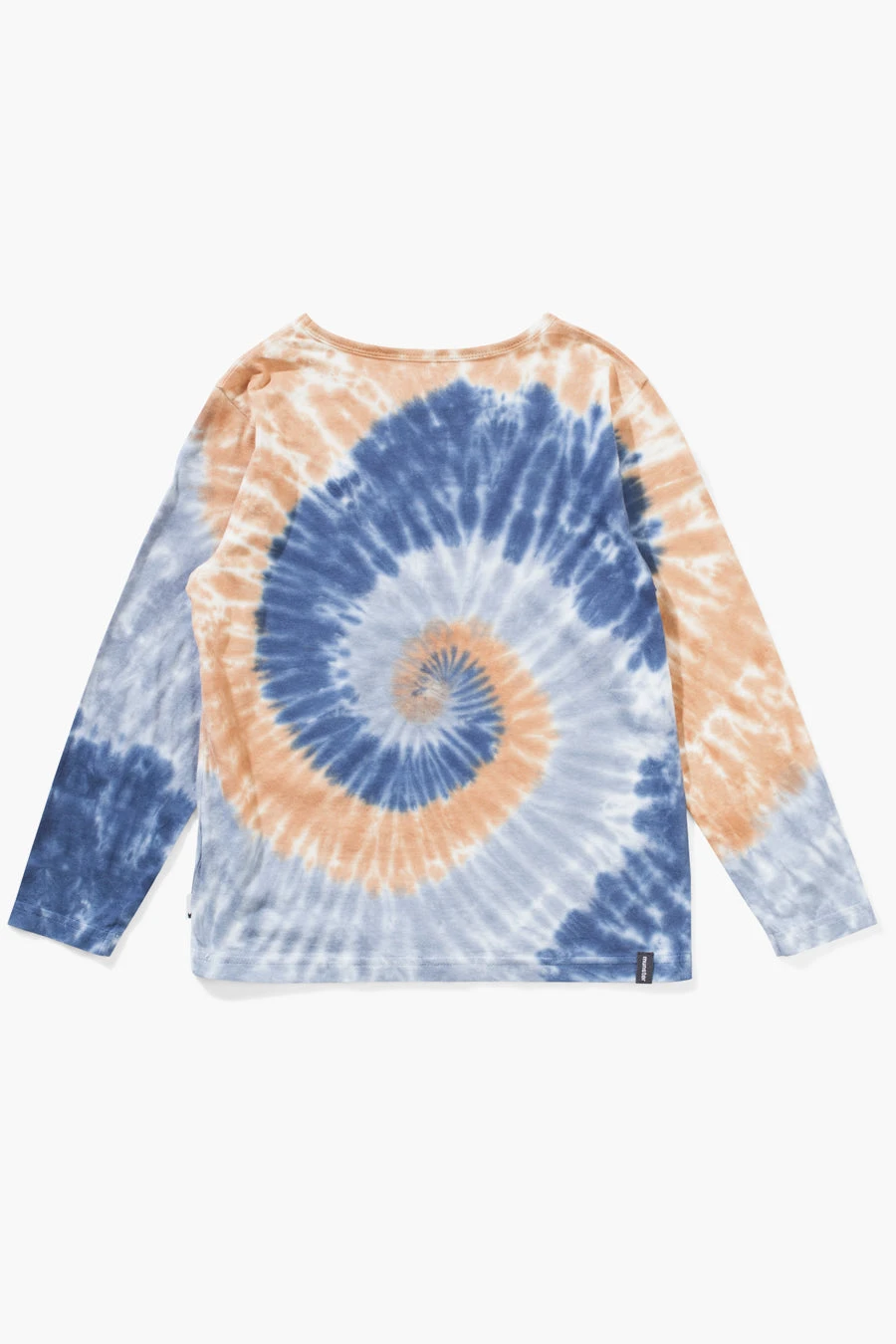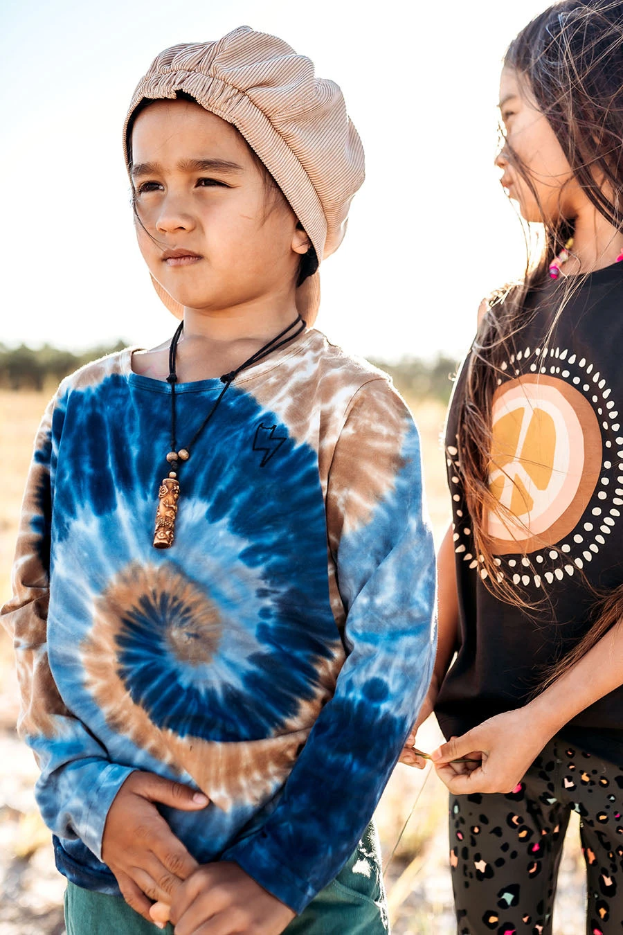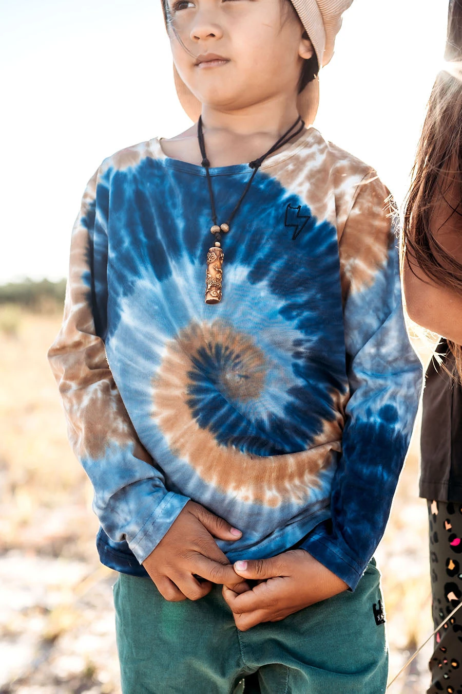 is a soft long sleeve kids shirt featuring a cheerful blue and tan tie dye design. 100% cotton, machine wash.