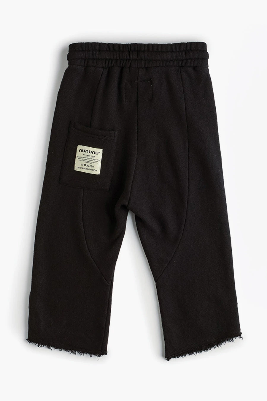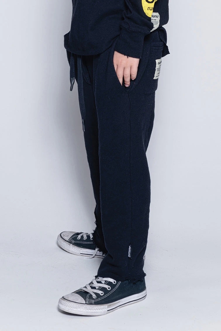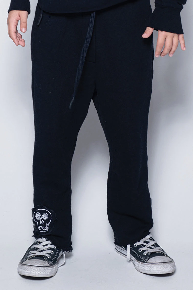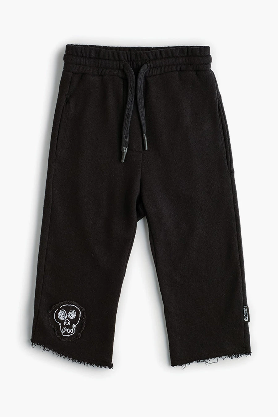 featuring a relaxed fit, a raw hem edge, skull patch and a drawstring elastic waistband for easy