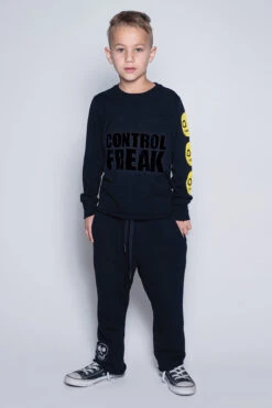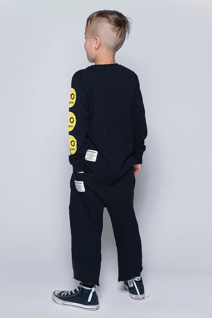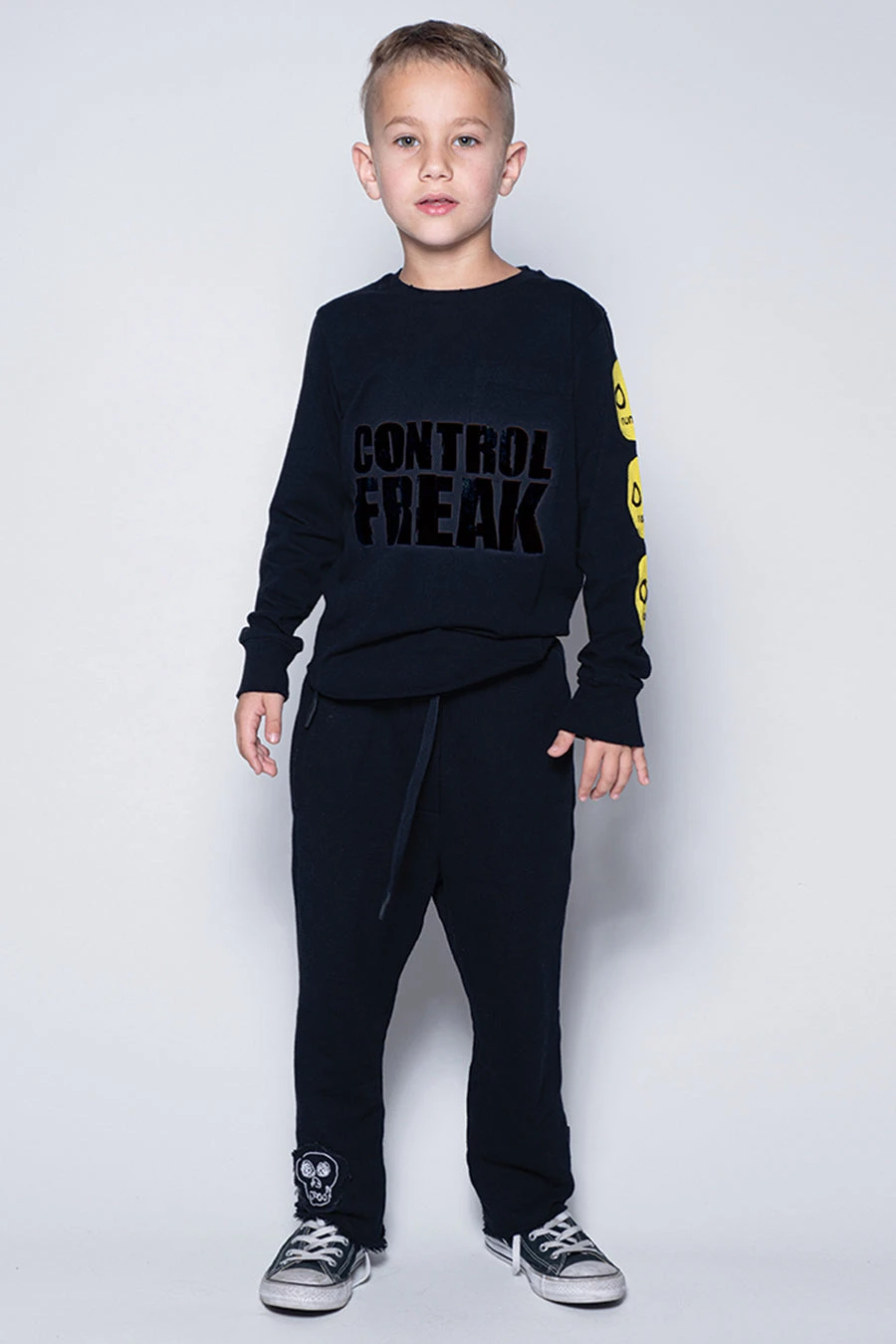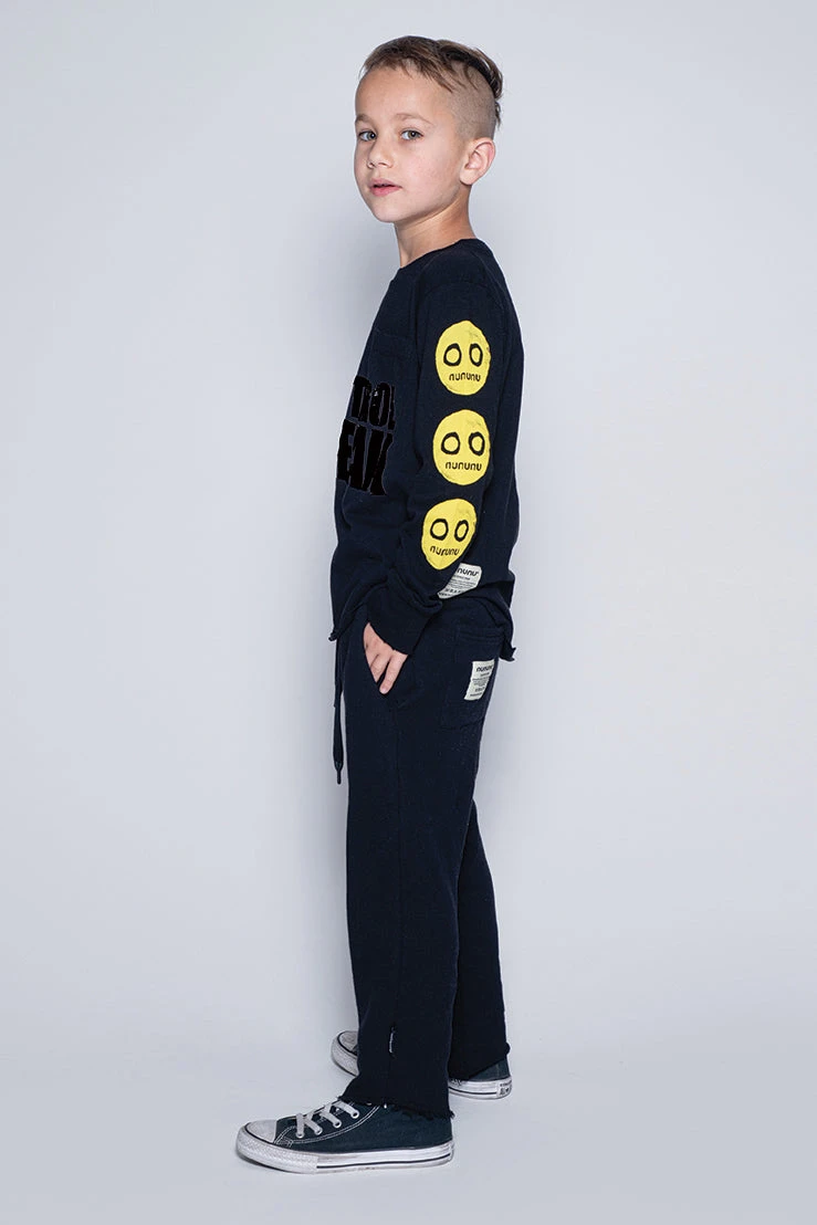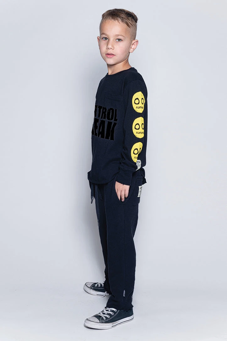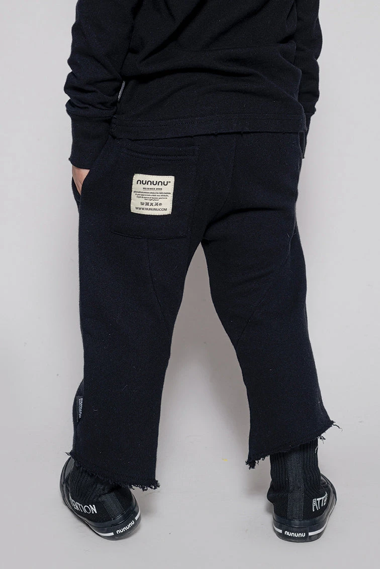 featuring a relaxed fit, a raw hem edge, skull patch and a drawstring elastic waistband for easy