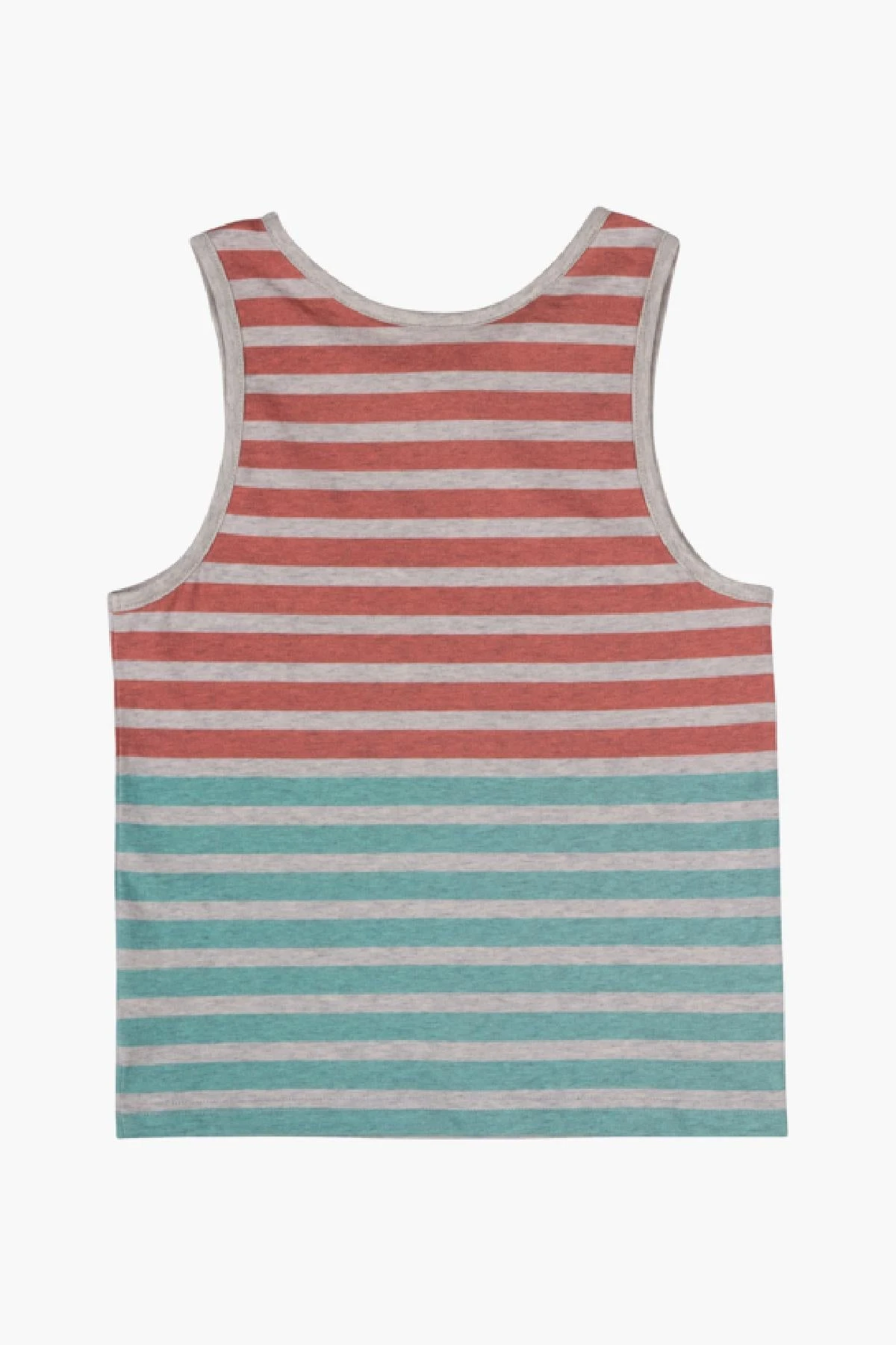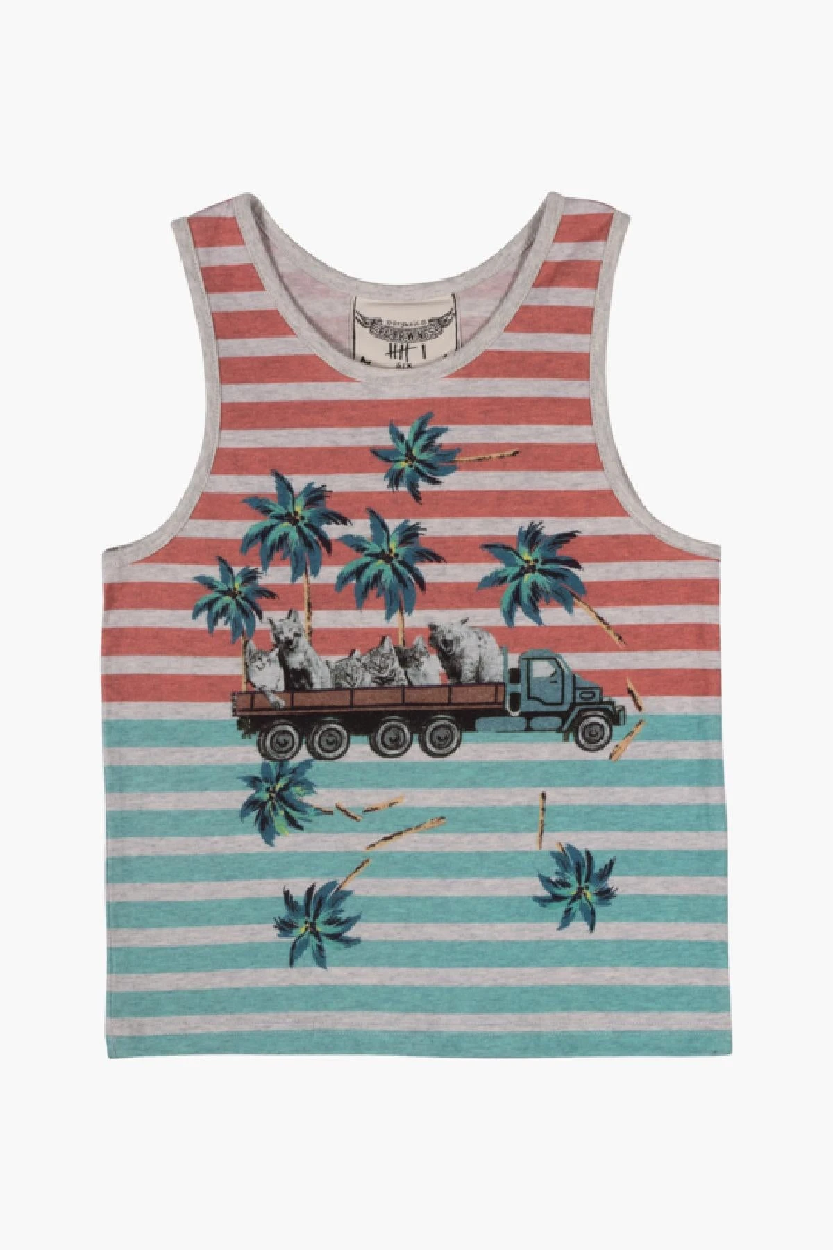 features a racer back design with complementary stripes and a palm tree and truck graphic print. Made in 100% organic cotton knit.