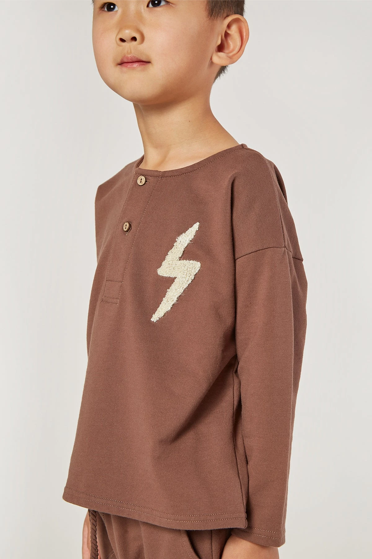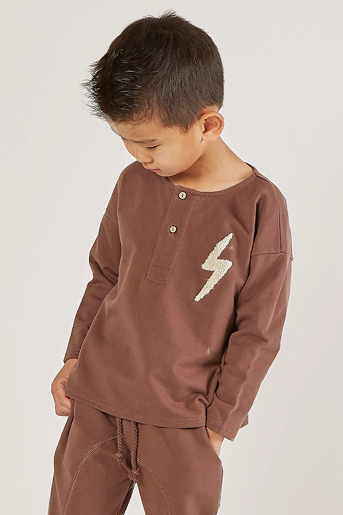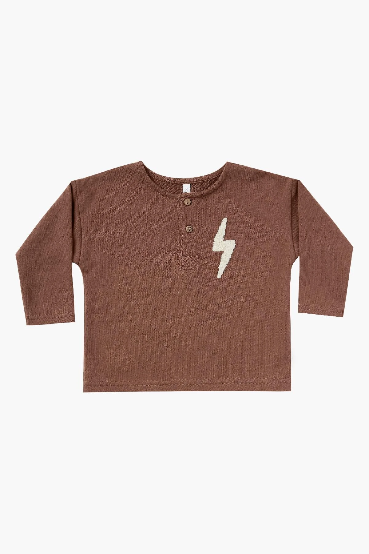 for any activity. Features a classic henley design, a two button placket, and a wool lightening bolt on the front. Made of 60% cotton and 40% polyester, machine wash cold.